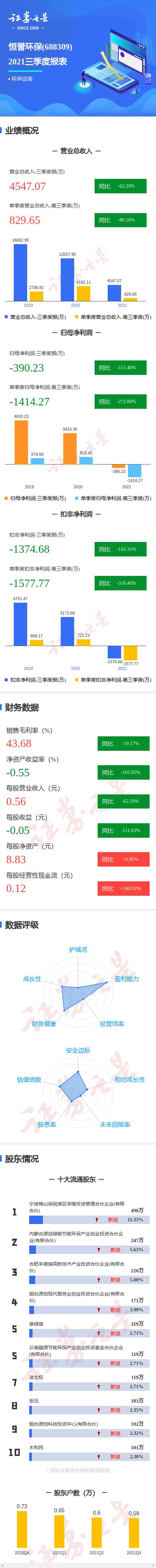 恒誉环保2021三季报显示,公司主营收入4547.07万元,同比下降62.29%;归母净利润-390.24万元,同比下降111.4%;扣非净利润-1374.68万元,同比下降143.31%;其中2021年第三季度,公司单季度主营收入829.65万元,同比下降80.16%;单季度归母净利润-1414.27万元,同比下降272.8%;单季度扣非净利润-1577.77万元,同比下降318.46%;负债率5.96%,投资收益429.79万元,财务费用-130.11万元,毛利率43.68%。