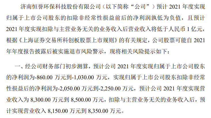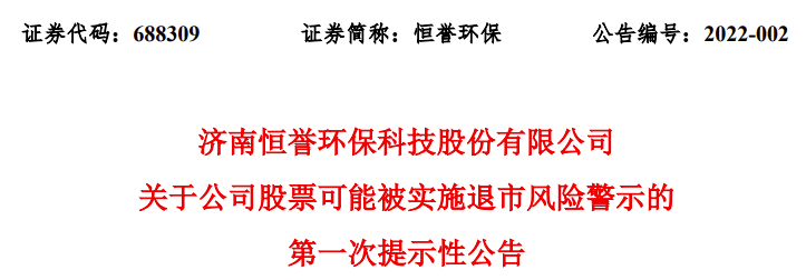 1月22日,济南恒誉环保科技股份有限公司(688309)发布《2021年年度业绩预亏公告》、《公司股票可能被实施退市风险警示的第一次提示性公告》,公司预计2021年实现营业收入8300万元到8500万元,预计2021年实现归母净利润为-860万元到-1030万元,根据《上海证券交易所科创板股票上市规则》,2021年度财务数据触及“营业收入低于1亿元+净利润亏损”的财务类退市组合指标,公司股票可能自2021年报披露(预约披露日2022年4月27日)后被实施退市风险警示(在公司股票简称前冠以*ST字样)。恒誉环保2020年7月14日才登陆科创板,上市第二年即亏损,很可能成为科创板384家上市公司中首家被实施退市风险警示的公司。本号“梧桐树下V”早在2020年4月26日就发文《这公司科创板IPO,特殊得有点异常,具有持续盈利能力吗?》,分析了恒誉环保四大问题: