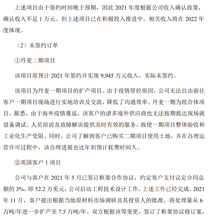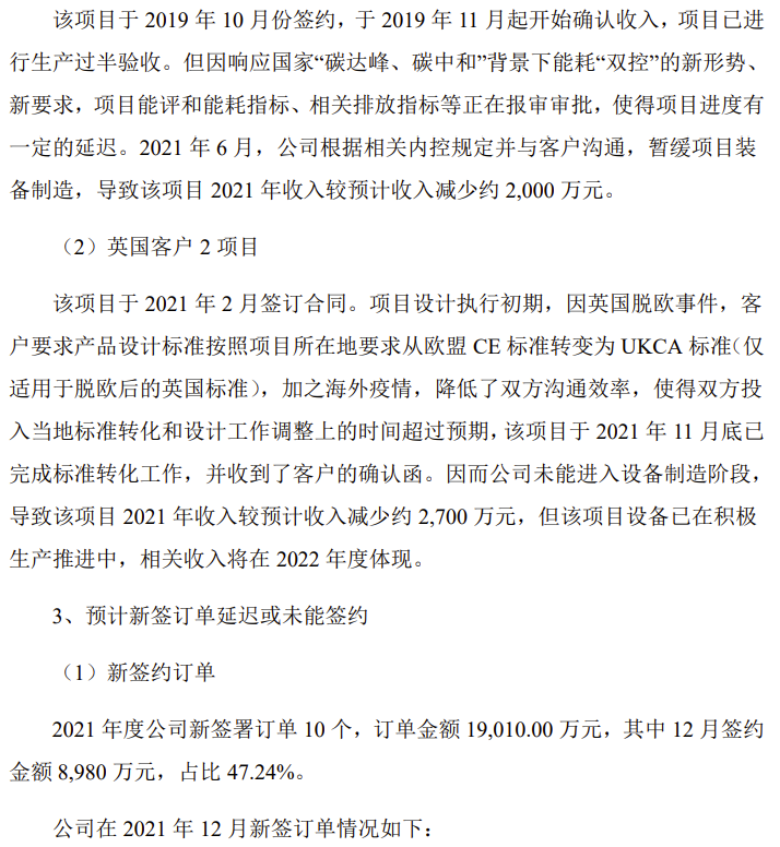 在这份公告中,公司宣称:公司核心竞争力和持续经营能力未发生重大不利变化。2021年度公司新签署合同10个,合同金额19,010.00万元(含税),与2020年相比,合同数量增长400.00%,合同金额增长540.93%。截至2021年12月31日,公司尚未确认收入的在手订单金额约为20,869.87万元(含税),按照目前在手订单的合同约定和客户最新的延期订单的执行计划,在手订单金额中预计约60%能够在2022年度确认收入。同时,目前公司国内外客户储备情况良好,2022年预期也将签订新的订单,并形成收入。公司产品仍具有技术先进性,公司的核心竞争力未发生变化。公司所属行业发展趋势良好。公司项目的示范效应正逐渐增强。公司产品应用领域不断拓展。