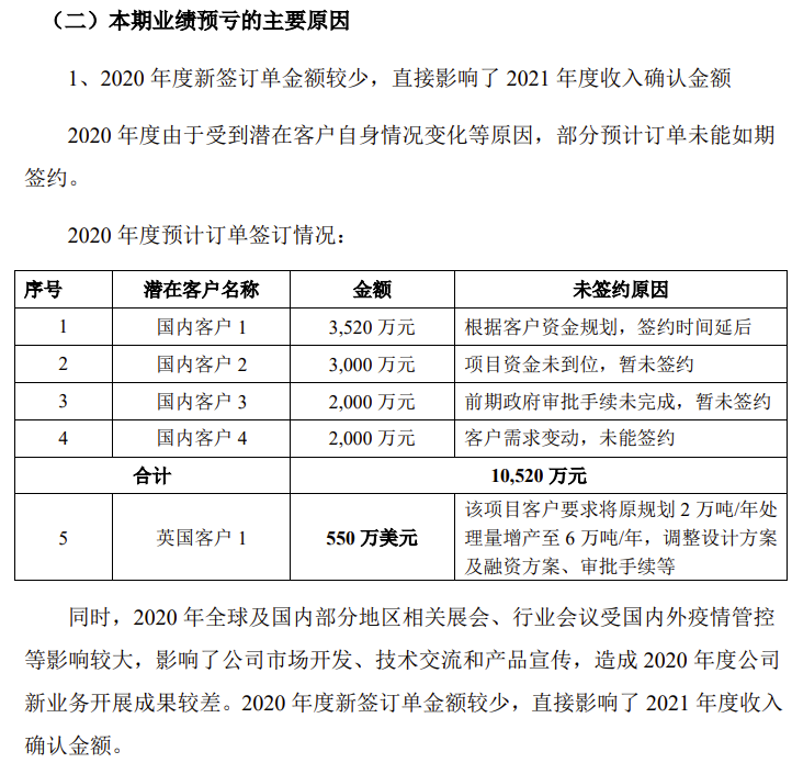 公司1月22日公布的业绩预亏公告分析了本期业绩预亏的主要原因有四个:1、2020年度新签订单金额较少,直接影响了2021年度收入确认金额;2、2021年度个别项目因政府审批等原因暂缓或暂停执行并受到新冠疫情等因素的影响,公司部分在手订单执行进度不及预期;3、预计新签订单延迟或未能签约;4、信用减值损失、合同资产减值损失对净利润的影响。