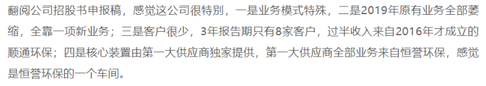 该文四个小标题分别为:1、生产主要依靠外协,生产人员只有26人;2、2019年度原有业务全部萎缩、全靠新增一项业务,公司业务模式是否发生重大变化?3、报告期过半收入来自第一大客户顺通环保,2016年才成立;4、第一大供应商只为恒誉环保服务,缴纳社保的员工只有11人,是恒誉环保的一个车间?