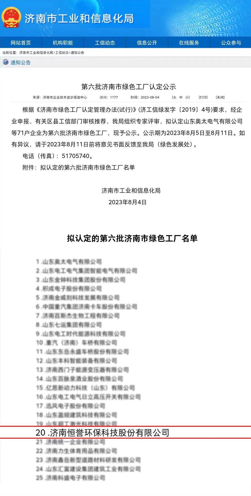 近期,经济南市工业和信息化局审核推荐,专家组评审认定,济南恒誉环保科技股份有限公司(以下简称“恒誉环保”)成功入选“绿色工厂”名单,成为本次唯一入选的环保领域上市企业。这是对恒誉环保推动行业绿色高质量发展,助力循环经济所获成绩的又一次充分肯定。