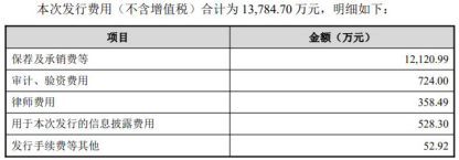 盟升电子上市发行费用为1.38亿元,其中保荐机构华泰联合证券有限责任公司获得保荐及承销费用1.21亿元,立信会计师事务所(特殊普通合伙)获得审计、验资费用724.00万元,北京市天元律师事务所获得律师费用358.49万元。