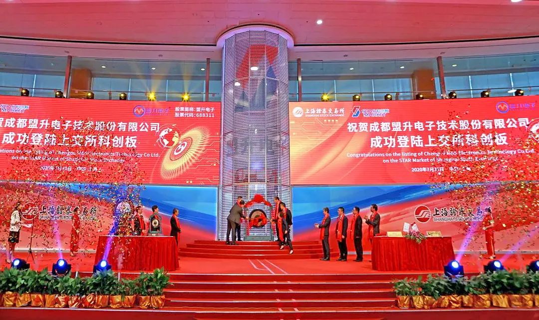 ▎2020年7月31日,响亮浑厚的锣声敲响在上海证券交易所大厅内,标志着盟升电子在上海证券交易所A股科创板正式成功上市,实现了天府新区科技企业上市零突破,上市祥锣的敲响,也意味着盟升电子即将走向新的发展阶段。