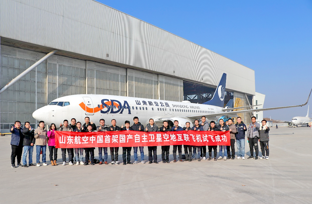 ▲ 2023年1月2日,山东航空中国首架国产自主卫星空地互联(IFC)飞机试飞成功。盟升电子KU单频机载卫星通信终端产品已在山东航空完成波音B737—800适航认证。