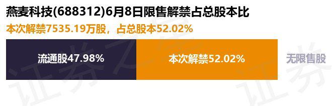 根据市场公开信息整理,燕麦科技(688312)于 6 月 8 日将有 7535.19 万股限售股份解禁上市,为公司首发原股东限售股份,占公司总股本 52.02%。最近一年内,该股累计解禁 255.02 万股,占总股本的 1.76%。本次解禁后,公司已无限售股份。具体如下图所示: