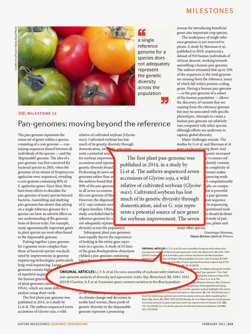 除水产领域外,包括人、动植物、微生物在内的全生命领域始终是诺禾致源重点关注的对象,比如大豆就是其中之一。2021年2月,Nature发布“近20年基因测序领域里程碑”,诺禾致源与中国农业科学院作物科学研究所共同合作的“一年生野生大豆泛基因组”项目位列其中。这项研究开启了动植物泛基因组研究历程,为后续动植物领域泛基因组的研究发展提供了方法和启示,具有里程碑意义。