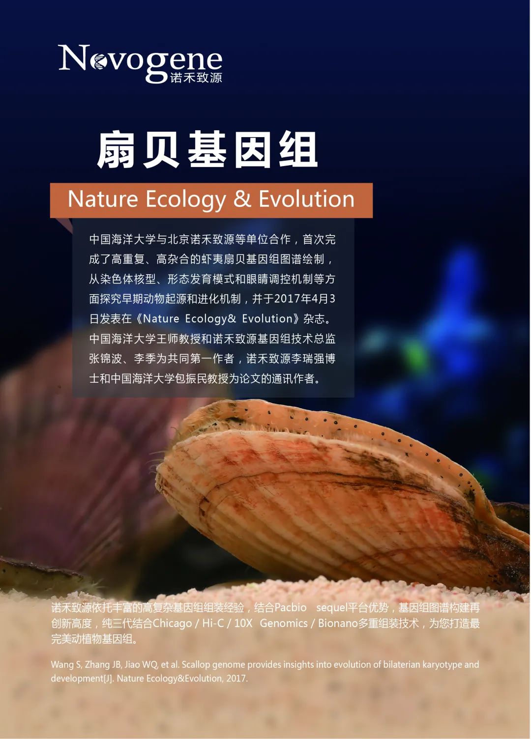2017年4月3日,诺禾致源与中国海洋大学等单位合作发表的题为“Scallop genome provides insights into evolution of bilaterian karyotype and development”的文章在国际生态与进化领域权威期刊 Nature Ecology Evolution 发表。研究人员通过对扇贝基因组进行深度解析,揭示了扇贝呈现众多原始动物祖先基因组特征;在探究原始动物祖先(Urbilateria)染色体核型进化、躯体结构多样性产生、眼睛起源和调控机制等方面获得了新发现,成功绘制了首张高质量扇贝全基因组图谱。