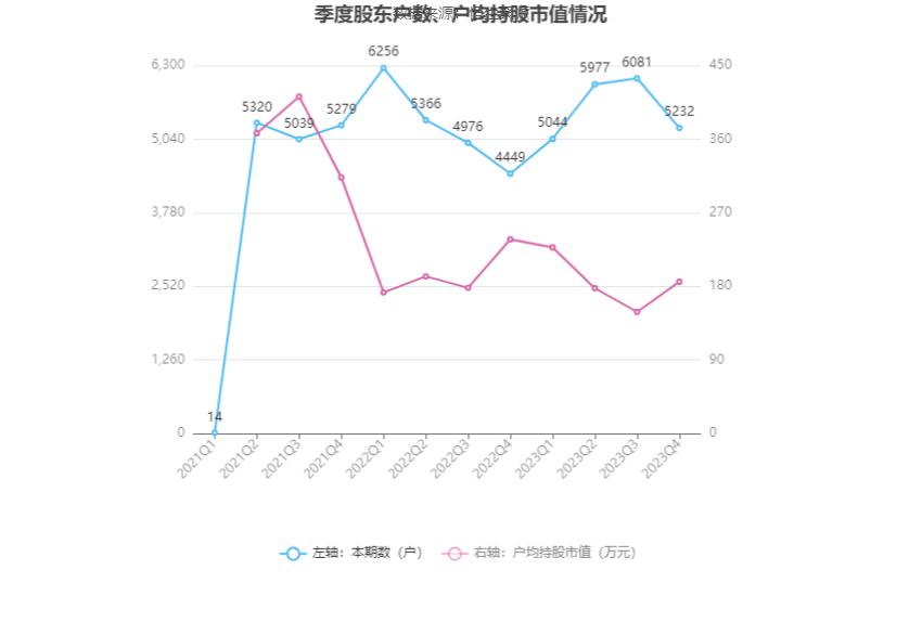筹码集中度方面,截至2023年年末,公司股东总户数为5232户,较三季度末下降了849户,降幅13.96%;户均持股市值由三季度末的148.73万元上升至185.67万元,增幅为24.84%。