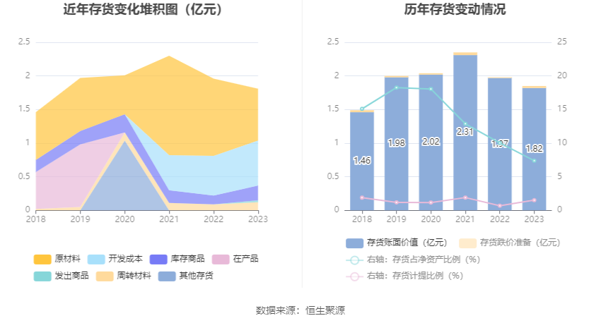 从存货变动来看,截至2023年年末,公司存货账面价值为1.82亿元,占净资产的7.39%,较上年末减少1558.05万元。其中,存货跌价准备为278.68万元,计提比例为1.51%。