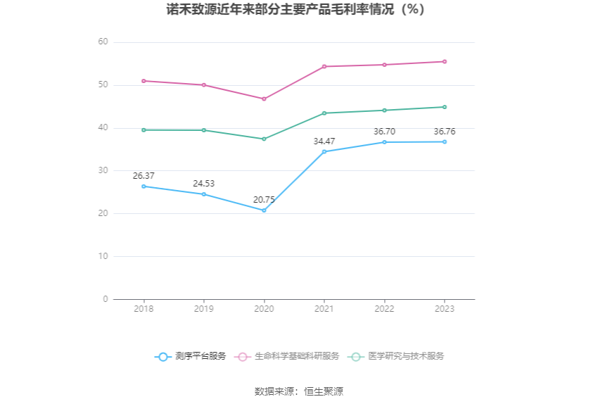 分产品看,测序平台服务、生命科学基础科研服务、医学研究与技术服务2023年毛利率分别为36.76%、55.48%、44.88%。