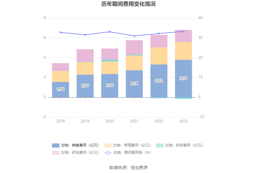 2023年,公司期间费用为6.66亿元,较上年同期增加4599.50万元;期间费用率为33.27%,较上年同期上升1.07个百分点。其中,销售费用同比增长14.31%,管理费用同比增长3.12%,研发费用同比下降1.1%,财务费用由去年同期的-940.94万元变为-1485.62万元。