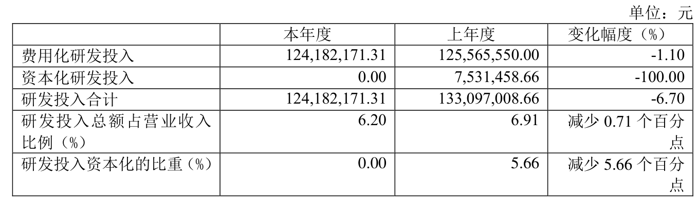 2023年全年,公司研发投入金额为1.24亿元,同比下降6.70%;研发投入占营业收入比例为6.20%,相比上年同期下降0.71个百分点。此外,公司全年研发投入资本化率为0。