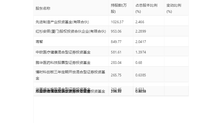 年报显示,2023年年末公司十大流通股东中,新进股东为泓德研究优选混合型证券投资基金,取代了三季度末的东方红产业升级灵活配置混合型证券投资基金。在具体持股比例上,中欧医疗健康混合型证券投资基金、华富成长趋势混合型证券投资基金、华富价值增长灵活配置混合型证券投资基金、广发医疗保健股票型证券投资基金持股有所上升,先进制造产业投资基金(有限合伙)、红杉安辰(厦门)股权投资合伙企业(有限合伙)、蒋智、鹏华医药科技股票型证券投资基金、博时科创板三年定期开放混合型证券投资基金持股有所下降。