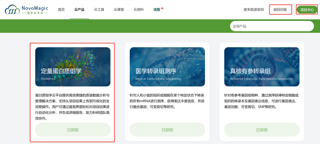 点击云产品中的“定量蛋白质组学”获取示例数据,进入“项目中心”即可体验新版云平台的高效功能,轻松操作;如需切换回旧版,点击“返回旧版”即可自由选择,助您畅享科研新体验!