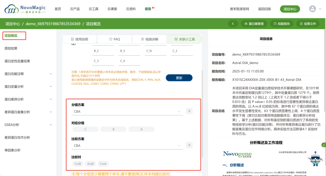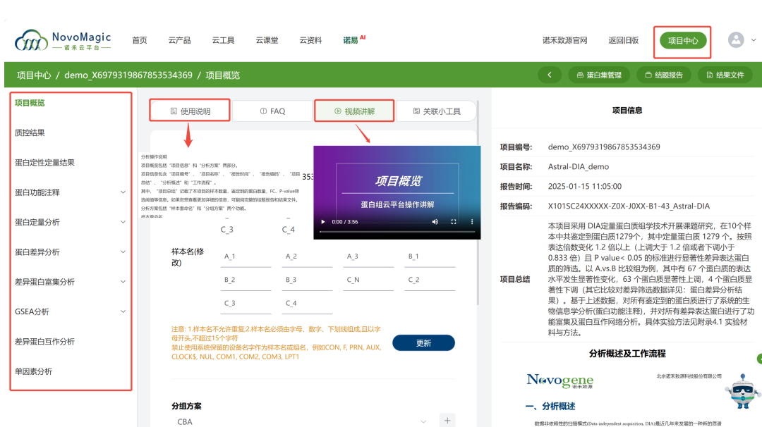 在项目中心,选择相应项目编号,点击“分析”后跳转到操作界面。左侧显示分析目录,包含蛋白功能注释、蛋白差异分析、GSEA分析、差异蛋白互作分析等多项分析内容;界面上方提供使用说明、FAQ、视频教程和关联小工具,帮助用户迅速理解操作步骤,轻松完成分析任务。