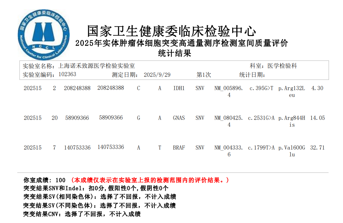 全国实体肿瘤体细胞突变高通量测序检测室间质量评价由 国家卫生健康委临床检验中心 (NCCL)定期组织实施,是评估与保证各临床实验室检测质量的权威标杆。 诺禾致源 多地实验室持续以满分成绩通过此项严苛评价,不仅印证了其检测体系在全国范围内的标准化与可靠性,更体现了公司“质量先行、精准为本”的一贯承诺。未来, 诺禾致源 将继续依托稳定、先进的技术平台与质量管理体系,为临床与科研提供坚实、可信赖的基因检测服务,助力诊疗决策,赋能精准医疗的可持续发展。