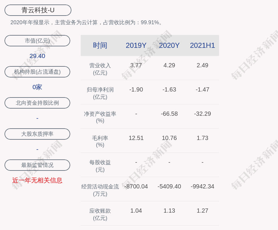 2020年年报显示,青云科技的主营业务为云计算,占营收比例为:99.91%。