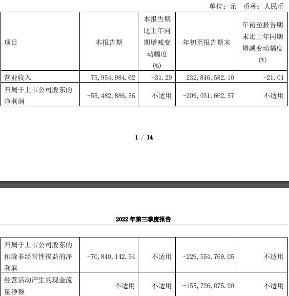 今年前三季度,公司实现营业收入2.33元,同比减少21.01%;实现归属于上市公司股东的净利润-2.09亿元;实现归属于上市公司股东的扣除非经常性损益的净利润-2.30亿元;经营活动产生的现金流量净额为-1.56亿元。