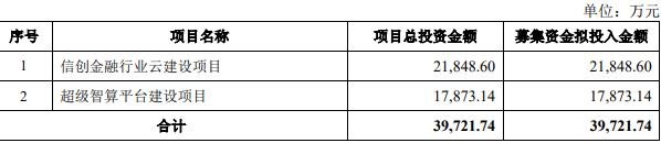 本次发行预计募集资金总额(含发行费用)为不超过人民币39721.74万元(含本数),扣除发行费用后拟用于信创金融行业云建设项目、超级智算平台建设项目。