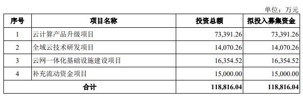 公司最终募集资金净额较原计划少5.01亿元。3月9日,青云科技发布的招股说明书显示,公司拟募集资金11.88亿元,将用于云计算产品升级项目、全域云技术研发项目、云网一体化基础设施建设项目、补充流动资金项目。