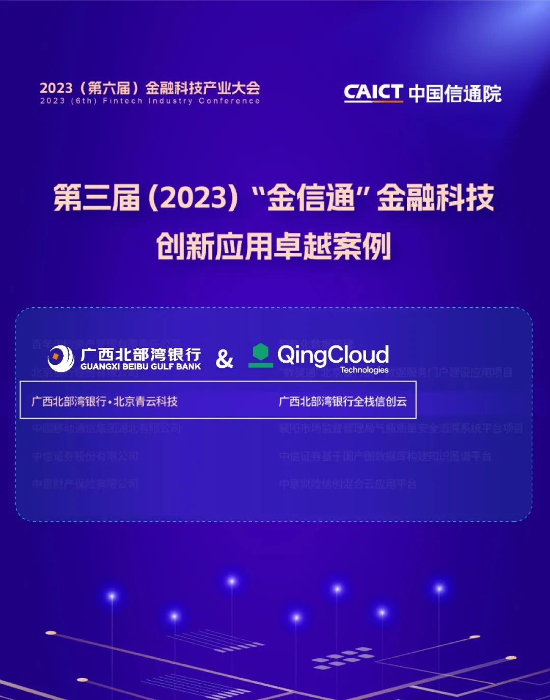 中国信通院联合金融科技产业生态各方,组织开展的第三届(2023)“金信通”金融科技创新应用案例征集活动结果公布,青云科技携手广西北部湾银行共同打造的《广西北部湾银行全栈信创云》案例脱颖而出,被评选为“金信通”金融科技创新应用卓越案例!