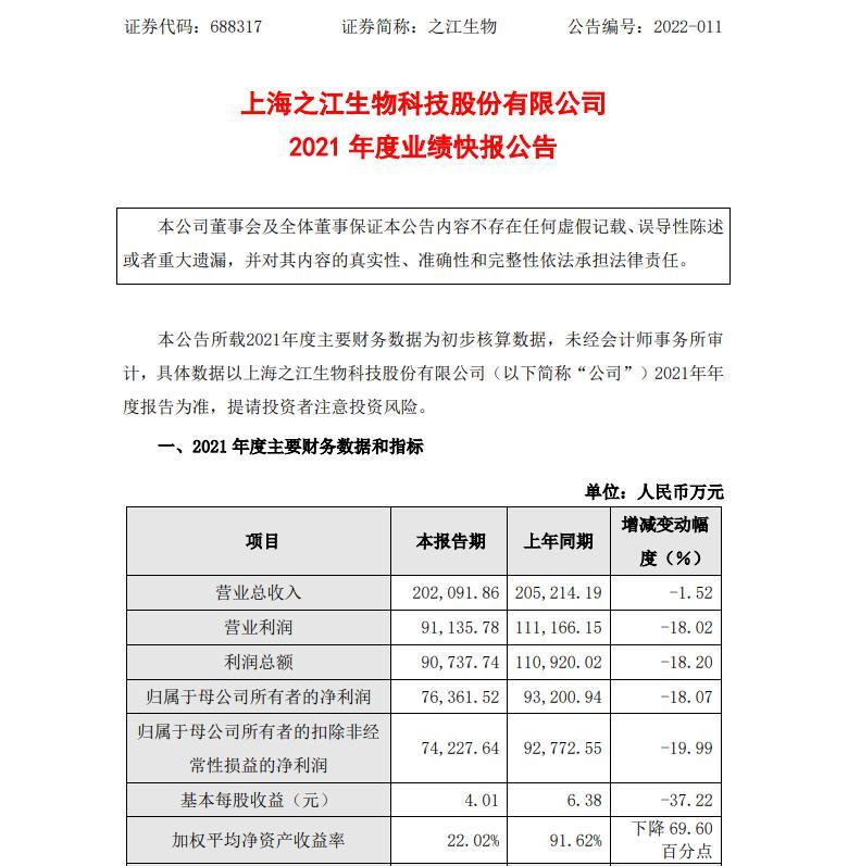 2月21日,之江生物(688317.SH)发布业绩快报称,2021年实现营业收入20.21亿元;同比下降1.52%;实现净利润7.64亿元,同比下降18.07%。