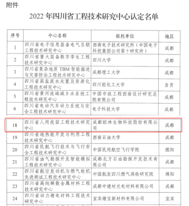 近期,四川省科学技术厅关于公布了《2022年四川省工程技术研究中心认定名单的通知(川科高〔2023〕1号)》,欧林生物获批“四川省人用疫苗工程技术研究中心”。