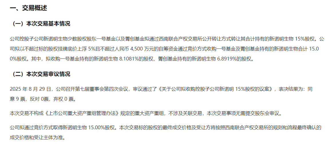 同一天,欧林生物发布了关于拟收购控股子公司少数股东股权的公告。公告显示,该公司控股子公司新诺明生物少数股权股东一号基金以及菁创基金拟通过西南联合产权交易所公开转让方式转让其合计持有的新诺明生物15%股权。公司拟以不超过标的股权挂牌底价上浮5%且不超过人民币4,500万元的自筹资金通过竞价方式收购一号基金及菁创基金持有的新诺明生物合计15.00%股权。