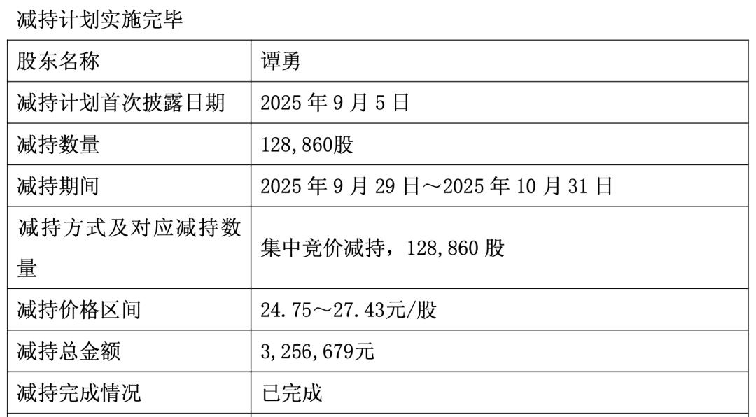 此外,2025年09月29日-2025年10月31日期间,公司副总经理、财务负责人谭勇通过集中竞价方式,以24.75元/股-27.43元/股的价格,累计减持128,860股,变现325.67万元,减持后持股比例从0.14%降至0.1090%。