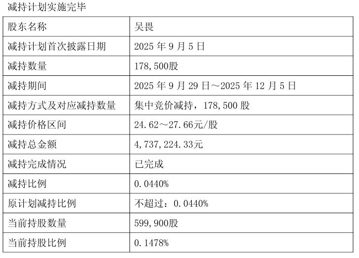 几乎同一时间,2025年9月29日-2025年12月5日,公司副总经理、董事会秘书吴畏通过集中竞价方式减持公司股份178,500股,占公司总股本的0.0440%,变现473.72万元,持股比例降至0.1478%。