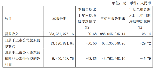 禾川科技发布的三季报显示,今年第三季度,公司实现归属于上市公司股东的净利润为1312.09万元,同比下降60.50%,前三季度实现归属于上市公司股东的净利润为6313.55万元,同比下降29.72%。