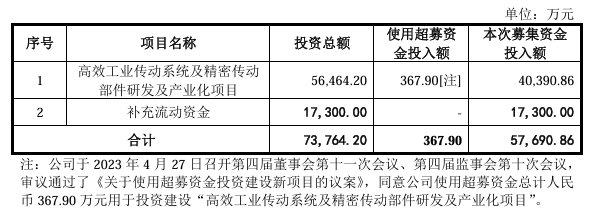 其中,“高效工业传动系统及精密传动部件研发及产业化项目”计划总投资5.65亿元,预计使用前次超募资金367.90万元,预计使用本次募集资金4.04亿元。