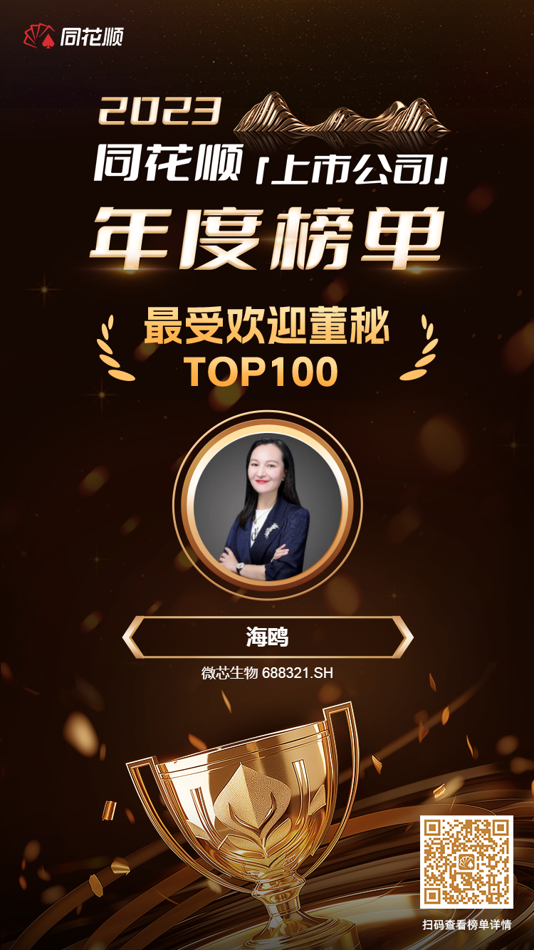 1月4日,2023同花顺上市公司年度榜单正式公布,微芯生物荣获2023年度“最具人气上市公司TOP100”奖项,公司董事、副总经理、董事会秘书海鸥女士荣获2023年度“最受欢迎董秘TOP100”奖项。