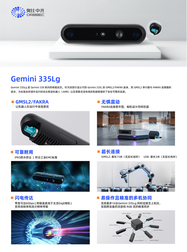 335Lg。该相机凭借GMSL2串行器与FAKRA连接器的完美结合,为在复杂环境中作业的自主移动机器人(AMR)及需灵活布线的机械臂提供了安全可靠的连接,从而赋予了机器人更加清晰且精确的视觉感知能力。