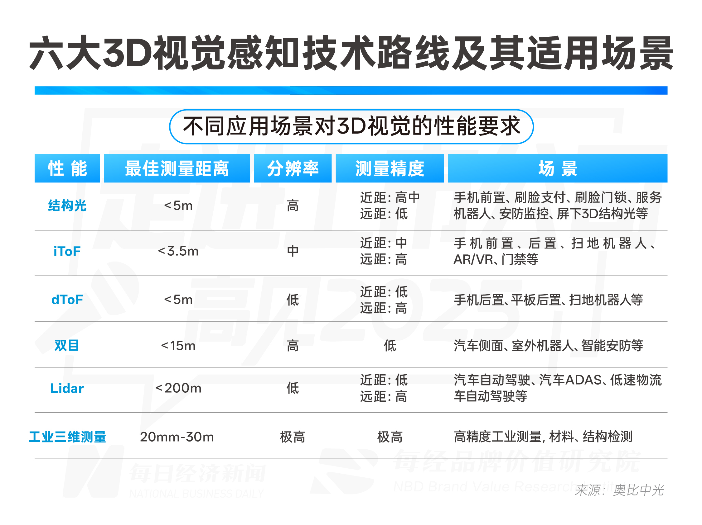 据介绍,3D感知企业不仅需要掌握核心芯片、光学、算法等底层核心能力,还需要具备结构光、iToF(注:间接飞行时间技术)、双目、dToF(注:直接飞行时间技术)、Lidar(注:激光雷达)、工业三维测量等全领域技术路线布局及相关产品开发的能力。