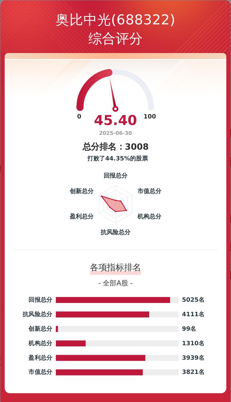 金融界上市公司研究院构建了一套上市公司韧性评价体系,从企业盈利、科技创新、股东回报、经营抗风险、市值表现及机构吸引力六个维度对企业进行量化评分,满分为100分。奥比中光的韧性评价总分为45.40分,在A股5405家可比上市公司中排名第3008位。