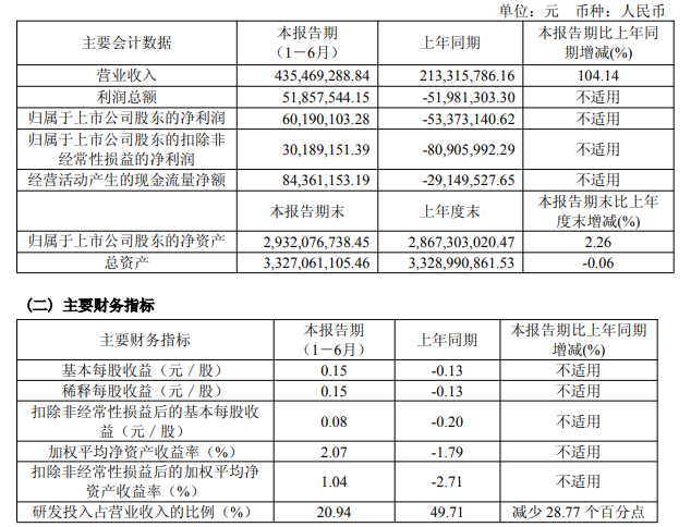 2025年上半年,公司实现营业收入43,546.93万元,同比增长104.14%;归属于上市公司股东的净利润6,019.01万元,较上年同期增加11,356.32万元。公司整体业务规模和盈利能力不断提升,向好趋势明确。
