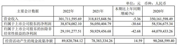 2022年,瑞华泰实现营业收入3.02亿元,同比减少5.36%;归属于上市公司股东的净利润3887.41万元,同比减少30.64%;归属于上市公司股东的扣除非经常性损益的净利润2919.13万元,同比减少42.68%;经营活动产生的现金流量净额8982.08万元,同比增长14.59%。
