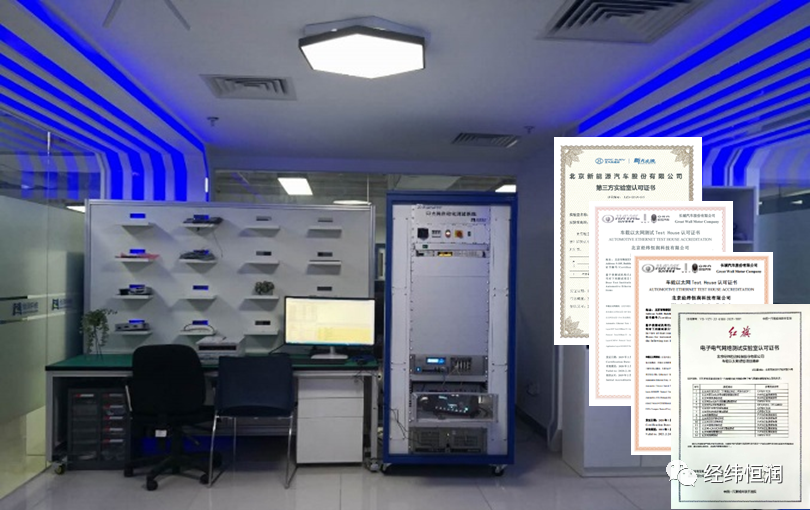 整车电子电气测试实验室建立于2014年,现有工作人员17名,占地面积80平方米,各类检测设备、仪器12台(套)。实验室在车载以太网(百兆)测试和车载以太网(千兆)测试方面有着丰富经验,是目前行业中规模与设备都较为先进的企业产品实验室。当前已与吉利、一汽红旗、北汽新能源、长城等OEM签订了第三方测试许可,为整车厂和相关供应商测试过上百个样件。