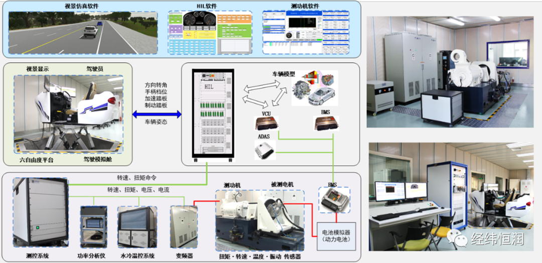 三电动力在环仿真测试实验室建立于2016年,实验室设置1个控制室、2个动力实验室,占地面积260平方米,其中试验场地188平方米,拥有各类检测设备、仪器11台(套),是国内较早把仿真测试和功率级台架集成一起的实验室。该试验系统兼顾了HIL仿真测试系统和测功机台架的优点,既可以进行软件功能逻辑测试,也可以进行整车级性能测试,还可以在车型开发过程中用仿真的手段进行超前测试。三电动力在环仿真测试实验室测试能力包括新能源车辆三电系统软件功能测试、故障诊断测试、整车动力性测试、整车能量管理测试等。该实验室除了支持用户租用外,也将技术迁移,已为国内重点高校创新中心、国家级智能网联测试中心、国内主流整车厂、造车新势力等多个用户成功交付该系统。