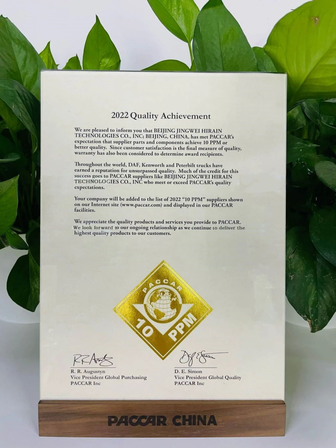 近日,经纬恒润再次荣获PACCAR集团颁发的10PPM质量奖,这代表着客户对我们2022年汽车电子产品质量的高度认可!同时,作为获奖单位,经纬恒润还将受邀参加4月21日PACCAR上海车展进行深入合作交流。