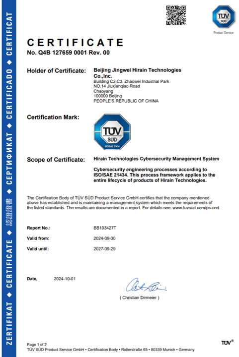 近日,经纬恒润顺利通过TüV南德意志集团总部的审查,获得ISO/SAE 21434汽车网络安全流程认证证书。这一荣誉标志着经纬恒润在汽车网络安全管理方面的技术实力和安全保障能力得到认可,已能够在全球市场环境下赋能主机厂量产项目的安全、合规落地,为智能网联汽车的网络安全提供坚实保障。