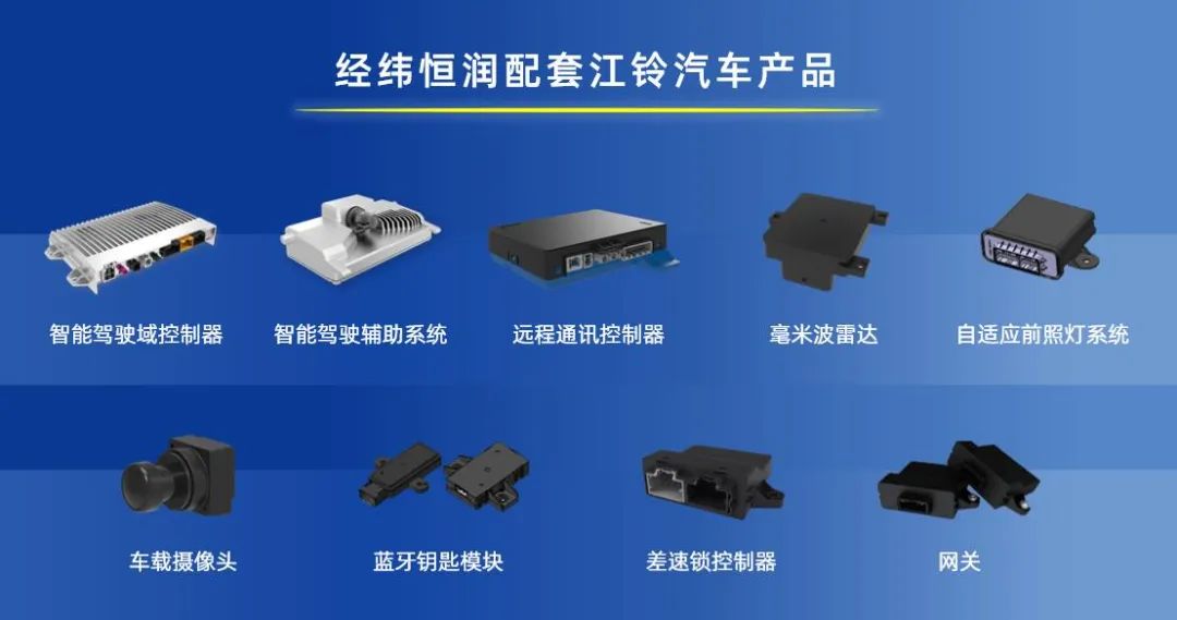 自合作伊始,经纬恒润同江铃汽车在配套产品及咨询服务领域展开了广泛而深入的合作,建立起长期稳定、互利共赢的伙伴关系。合作产品涵盖了智能驾驶域控制器ADCU、智能驾驶辅助系统ADAS、远程通讯控制器T-BOX、网关GW、自适应前照灯系统AFS、毫米波雷达、蓝牙钥匙模块、前视摄像头等,适配领睿、领裕、大道、游骑侠、全顺T6、全顺T8、E全顺、E福顺等多款热门车型。凭借多年来在汽车行业的精研创新,经纬恒润的产品及服务不断升级,赢得了客户的高度认可。