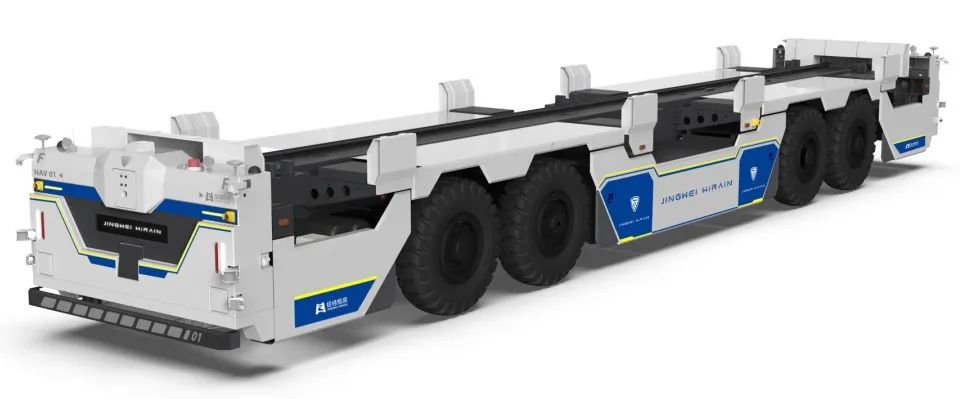 此项目的运输载具采用经纬恒润研发的第三代重载自动驾驶平板车HAV,配备北斗高精定位及5G通信技术,底盘结构强度优异、电控设备均满足车规级要求,高精度四桥八轮转向控制系统可实现直行、斜行、八字转向模式的无缝切换,基于扭矩的四驱分配控制可有效减少磨胎情况,提高运行稳定性。搭载ABS的制动系统,可应对路面打滑等极端工况。