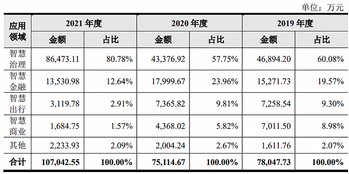 如果说云从科技的收入在“量”上还只是略有不足,那在“质”上可以说是大幅滑坡。目前公司收入主要分布在智慧治理、智慧金融、智慧出行和智慧商业四个赛道。2020年,智慧金融和智慧出行板块还尚有增长,到2021年则急转直下,公司除智慧治理外的板块收入都出现急剧收缩,智慧治理收入占比从2019年的60.08%提升至2021年的80.78%,公司的路是越走越窄了。