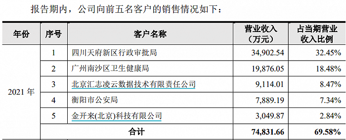 2021年,云从科技第一和第二大客户分别为四川天府新区行政审批局和广州南沙区卫生健康局,两家客户都属于智慧治理板块,合计收入占比超过一半。