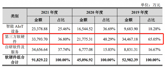据招股书可知,云从科技需外购从第三方购入软硬件产品,且第三方软硬件产品收入占比较高,2019-2021年占人工智能解决方案收入的比例分别为 57.71%、42.32%和 36.17%。在2021年以前,第三方软硬件甚至是软硬件组合收入的最大收入来源,2019年占比高达65.05%,2021年才降至36.8%。尽管营收贡献大,但毛利率又很低,只有5.36%。