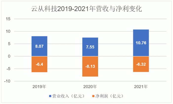先看营收情况。2019-2021年,营收分别为8.07亿、7.55亿和10.76亿元,同期归母净利润分别为-6.40亿、-8.13亿和-6.32亿元。可以看到,在2020年,云从科技一年的营收都不够亏的。而这三年的复合增长率仅为15.42%,与未来三年33.6%的复合增速还有一定差距。