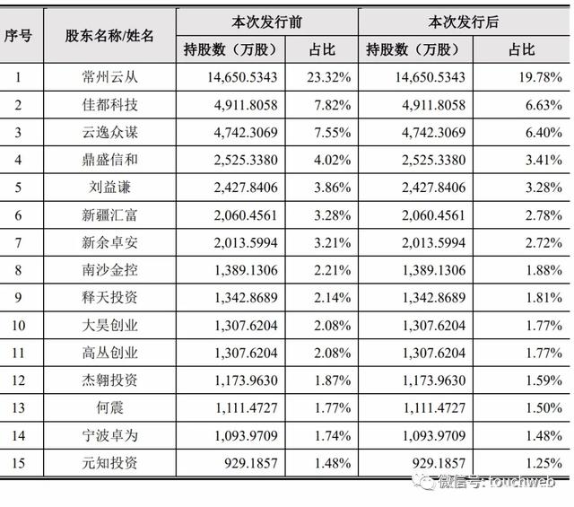 IPO后,常州云从持股为19.78%,佳都科技持股为6.63%,云逸众谋持股为6.40%,鼎盛信和持股为3.41%,刘益谦持股为3.28%;